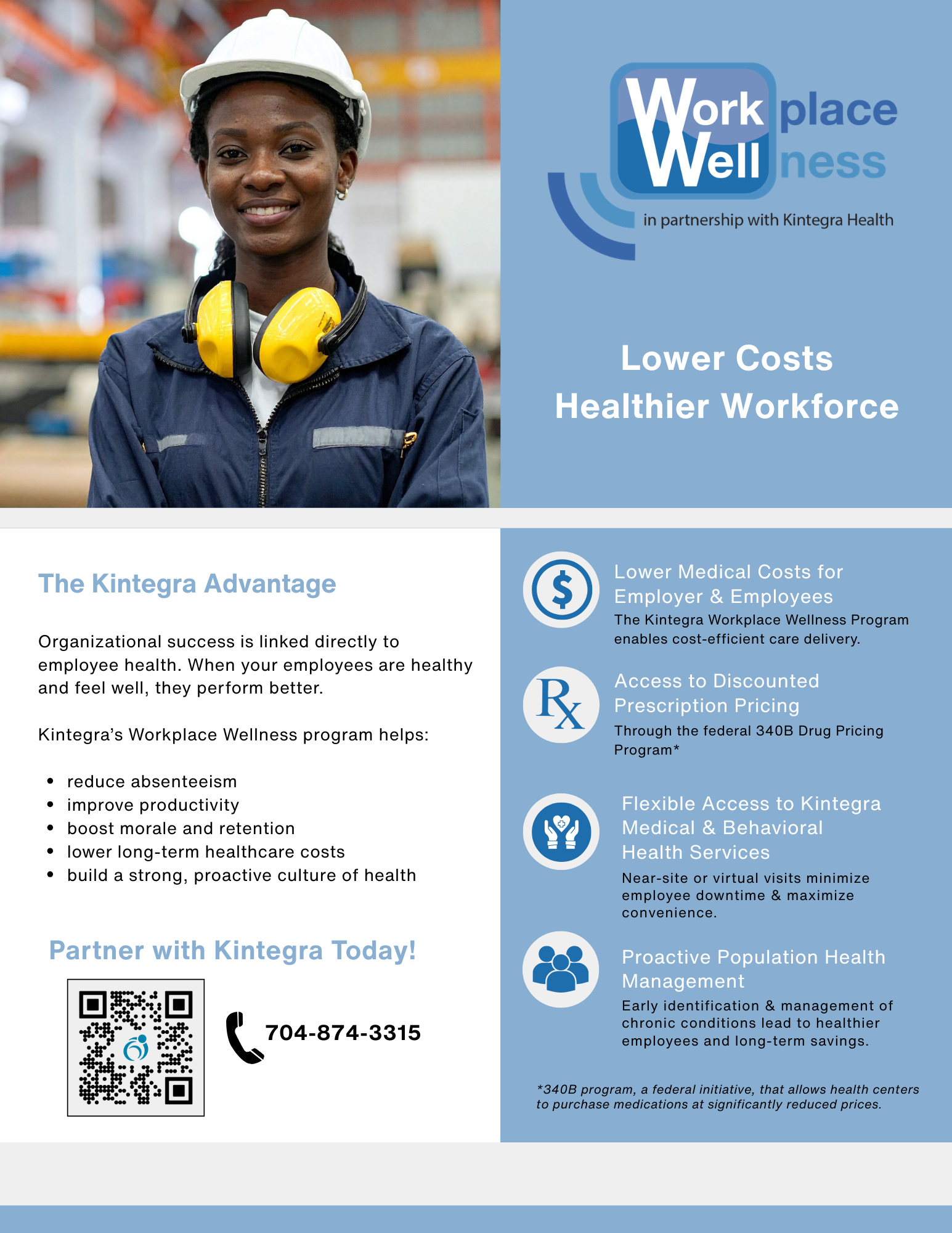 Kintegra’s Workplace Wellness program partners with employers to create a customized, self‑funded health care solution that supports employee health while optimizing organizational resources. By connecting employees to high‑quality primary care at Kintegra’s family medicine clinics, the program improves access to care, encourages preventive health and helps manage long‑term health costs.